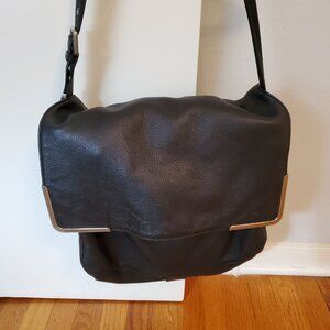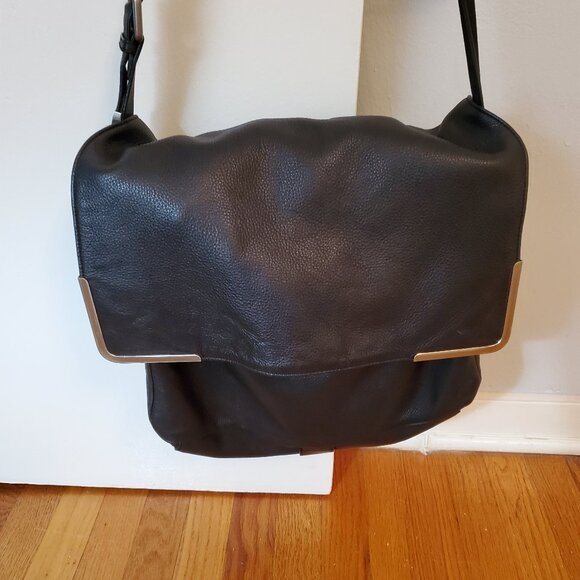 THIS IS A KENNETH COLE NEW YORK BLACK LEATHER PURSE WHICH CAN BE USED AS A SHOULDER BAG OR CROSS-BODY. IT IS IN ALMOST UNUSED CONDITION. IT MEASURES 13-3/4" IN WIDTH, HEIGHT 12-1/2", AND THE SHOULDER STRAP MEASURES 15". THE DETAIL ON THE BAG IS IN SILVER. THERE IS AN INSIDE ZIPPER COMPARTMENT.