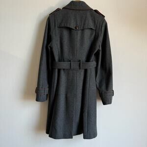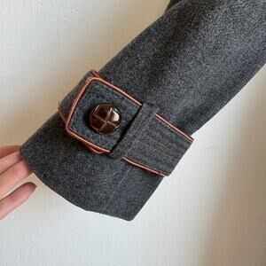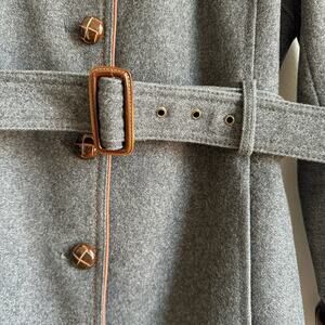 Details: Gray wool & cashmere blend Sherlock Holmes style coat with belt, epaulettes, round "leather" basket weave buttons, and brown piping
