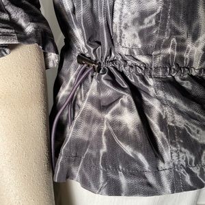 Marble-like smoky patterned taffeta jacket. Funnel collar and bell sleeves. Cinch cords at waist and 3/4 sleeves, lined and two front pockets. Logo’d zipper pull.