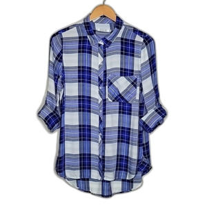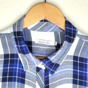 Blue (various shades) and white plaid, long-sleeved, button-down shirt with a collar made by Kenneth Cole Reaction in size Medium. Made out of and is soft to the touch. Left chest pocket. 6 buttons down the front, 1 at each sleeve cuff, and 1 at each elbow. Roll tab sleeve allows them to be rolled up and secured in position (see 2nd picture). High low hem with a shorter front and longer back. There is a small hole on the left sleeve cuff and the thread has slightly unraveled on the back at the pleat (see last 2 pictures). Both are easy fixes if you are able to sew! Aside from that, the rest of the shirt is in EUC with no stains. Bundle with other items from my closet for the best deal!