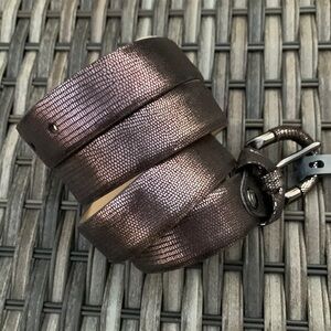 Gorgeous metallic snakeskin belt from Kenneth Cole Reaction featuring a partially covered buckle and bow detail.