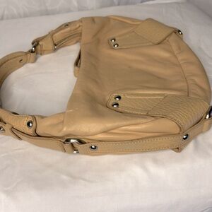 KENNETH COLE REACTION light tan colored leather crescent shaped shoulder bag. Silver hardware. PreLoved. Photos do show a missing large silver stud on strap. Photos show small marks on back exterior and inside of bag. Super cute. Measures approximately 12 X 7 X 2 inches see.