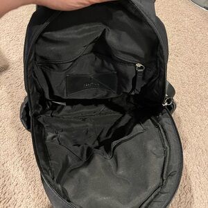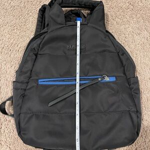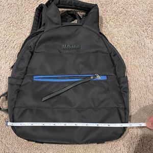 KENNETH COLE REACTION genuine non-leather, vegan friendly Unisex Black backpack with blue zipper #backpack, dual handle, water resistant, barely used. No flaws, no stains. Nylon/ polyvinnyl material. 2 side pockets, 2 front pockets, 3 pockets inside.