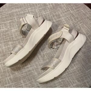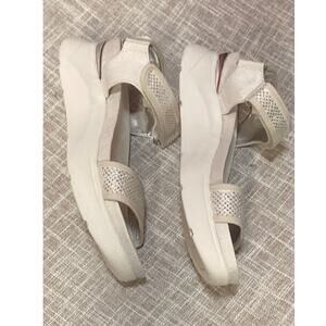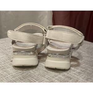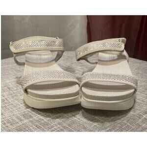 Step out in fashion with these comfy sport sandals that feature mini crystals on the ankle strap and front strap for a subtle sparkle that will take you from day to night. They are Ivory in color with adjustable velcro straps.