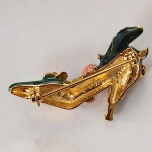 Charming Shoe Brooch with Green Gody and Pink Accents.