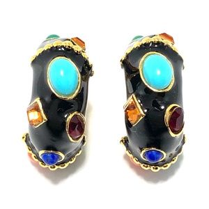 KENNETH JAY LANE, WHITE OR BLACK ENAMEL GOLD CLIP EARRINGS WITH TURQUOISE CABOCHON AND MULTI GEM STONES ACCENT