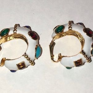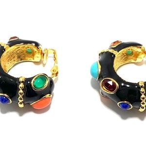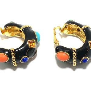 KENNETH JAY LANE, WHITE OR BLACK ENAMEL GOLD CLIP EARRINGS WITH TURQUOISE CABOCHON AND MULTI GEM STONES ACCENT
