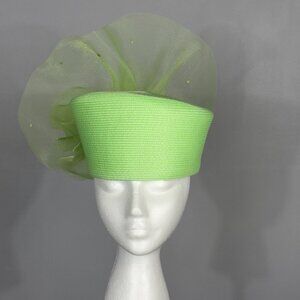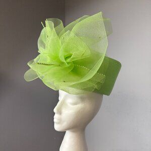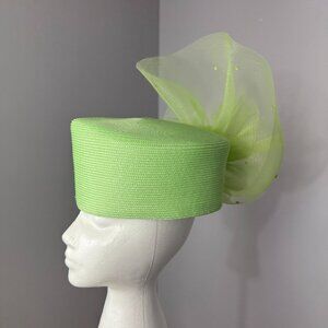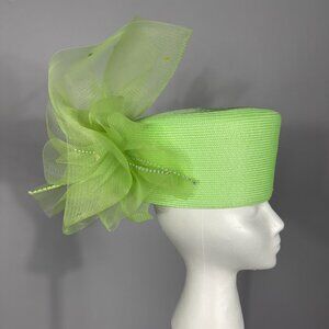 Beautiful lime colored hat. Wear the bow in the front, on the side, or in the back! Beautiful sturdy hat box included. Excellent condition.