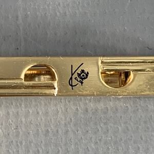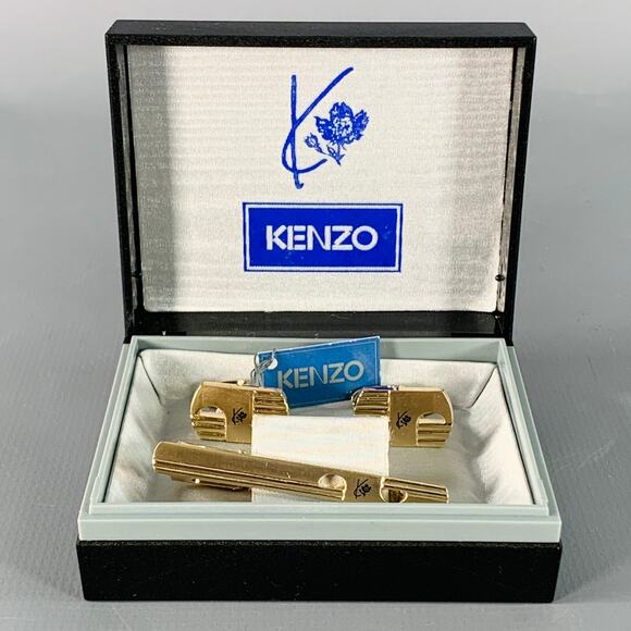KENZO PARIS cufflinks & tie clip set in a gold tone metal featuring monogram K with rose logo. Comes with box.