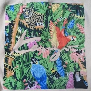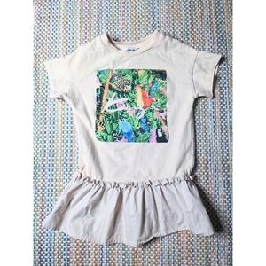 This jersey crewneck dress features a ruffled poplin hem and tropical jungle motif on the chest.