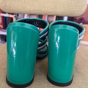 The KENZO 'Ana' heeled mules are a striking design made from high-shine leather in a green, white and blue colourway. The strappy, open toe heels have been designed with a classic mule silhouette and feature three tri-coloured straps across the foot. Set upon a chunky block heel for height. Branded dust bag included.