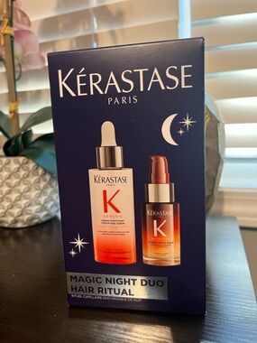 Magic Night Duo Hair Ritual for overnight hair repair. Features orange-gold packaging and concentrates to strengthen and nourish hair. Apply as directed to revive and protect hair while you sleep. Ideal for improving hair resilience and shine.