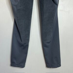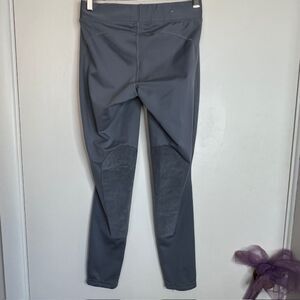 Gray knit riding leggings, tights with 2" wide elastic waist, polyester micro-suede knee patches, and non-slip hems. Made of machine washable 91% Micro-poly 9% Spandex body and Polyester Ultrasuede patches. In excellent condition.