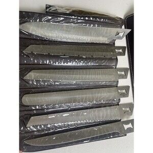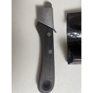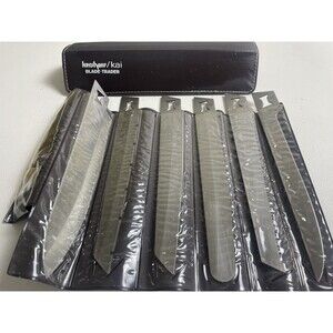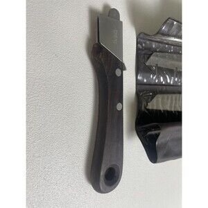 The Kershaw/Kai Blade-Trader model 1099 is a vintage multi-blade knife set from the 1980s, featuring a wooden handle and a combination of over 5-inch stainless steel blades. This set includes 6 knives, a case, and original papers. Made in Japan, this ambidextrous knife set is a collector's item with a variety of blade types suitable for different tasks.