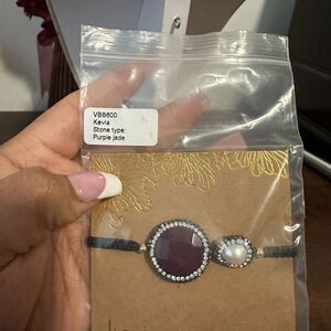 Gemstone bracelet featuring 1" purple jade medallion with pearl accent on black macramé cord with sliding clasps for adjustability.