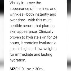 Multi-peptide serum targets dryness and dullness.Visibly improve the appearance of fine lines and wrinkles—both instantly and over time—with this multi-peptide serum that plumps skin appearance. Clinically proven to hydrate skin for 24 hours, it contains hyaluronic acid in high and low weights for immediate and lasting hydration.