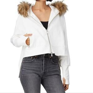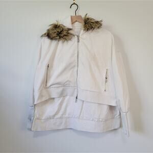 In luxe white performance twill, this KF/KaufmanFranco Collective jacket keeps things sporty-chic with a boxy fit, ribbed cuffs with a thumb hole sleeves, and a white faux fur trimmed hood.