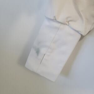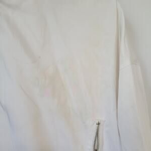 Features: White performance twill with faux fur trim (100% Polyester). Jacket. Long sleeves. Fully lined. 19" from shoulder to shortest hemline.