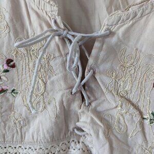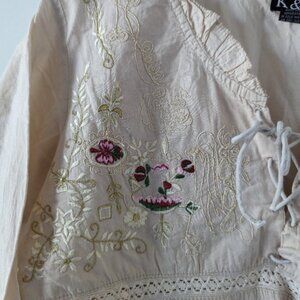 Description: This is a womens tunic from the brand K&G in size medium. It features a soft beige color with intricate embroidery on the front including floral patterns in pink green and yellow. The tunic is designed with a V-neckline accented with a lace-up detail and a gently gathered bust. Lace and ruffle details along the seams add a feminine touch. The tunic is made of cotton ensuring breathability and comfort. Style keywords for this item include bohemian folk vintage-inspired and casual-chic. Its a versatile piece that could be styled for a relaxed day out or a casual gathering reflecting a laid-back yet refined fashion sense.