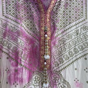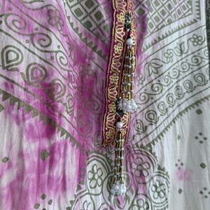 Beautiful Khaadi artisan tunic top in Size 10 featuring intricate embroidered neckline, printed geometric motifs, and soft pink tie-dye accents throughout. Lightweight and flowy with side slits for movement. Perfect for warm weather, layered styling, or a relaxed boho look.