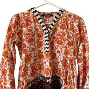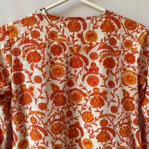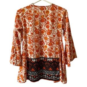 Size 6, orange, white and black floral print, 100% cotton, long bell sleeves, swing style, single snap at v neck - NOTE loose threads just under the snap.