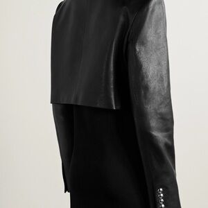 KHAITE's 'Samuelson' jacket is reminiscent of military styles, thanks to the high neckline and polished silver-tone buttons. Made from black leather, it has a boxy, cropped shape and angular padded shoulders for structure. Sleek black leather jacket with bold button details.