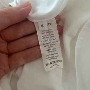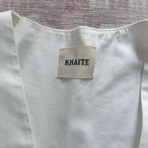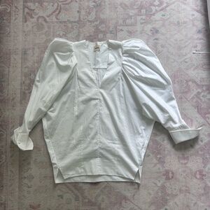 Very gently used (only for a photoshoot!) stunning white cotton KHAITE blouse. Dramatic sleeves, a deep v-neck, and a pleated back make this beautiful, oversized blouse a winner!
