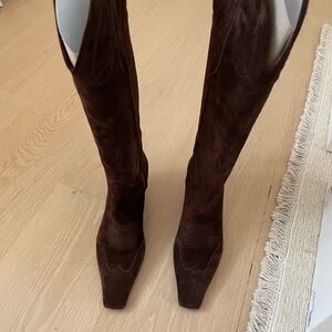 Chic dark brown suede boots by KHAITE. Sleek design with a stylish heel. Ideal for elevating any outfit.