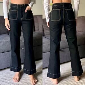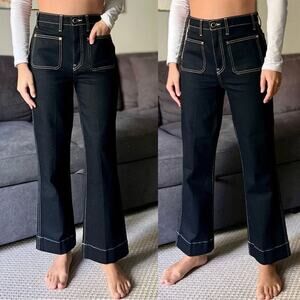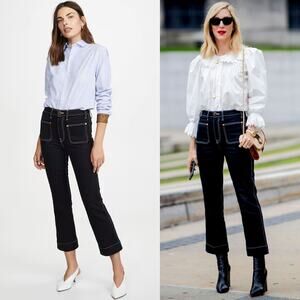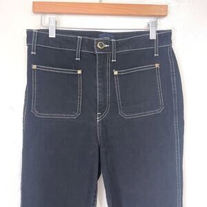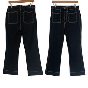KHAITE Raquel Patch Pocket Flare White Stitch Cropped Jeans in Black Size 30