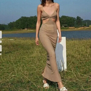 KHAKI BODYCON CUT OUT SPLIT MAXI DRESS