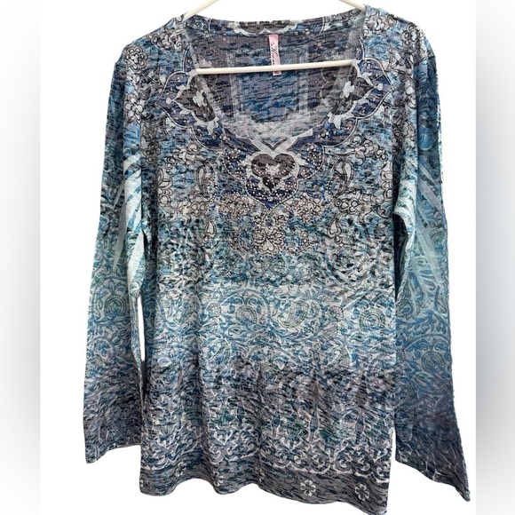 🦋KIARA long sleeve top round neckline rhinestone paisley pattern shapire SZ XL