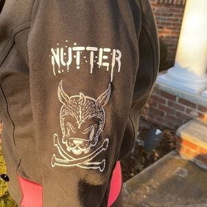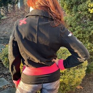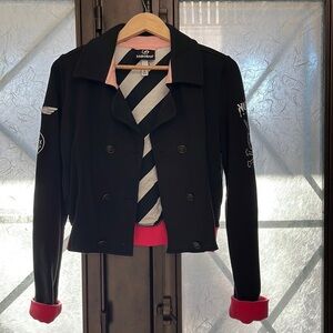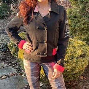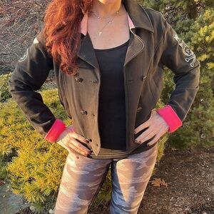 KIDROBOT KRONK NUTTER VINTAGE PEACOAT-STYLE DOUBLE BREASTED JACKET. Collectors kidrobot jacket, with a lot of fun details! Numbered piece- 235 (see pic). Peacoat button closure with hook-and-eye neck closure. Patches, embroidered designs, and decaled. Attached pink cuffs and waistband. Super comfy sweatshirt-like fabric . Easy to dress up or down. Bought for myself don’t remember if I bought in kids or women’s department (I usually wear a size small - go by measurements listed below) sweatshirt like material.