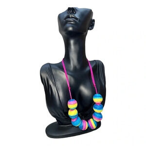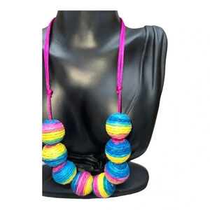 COLORS: HOT PINK NYLON CORD; BLUES/GREEN/YELLOW/PINK/PURPLE TEXTURED BEADS