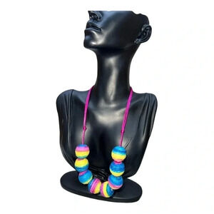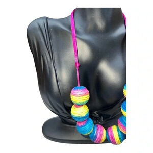 COLORS: HOT PINK NYLON CORD; BLUES/GREEN/YELLOW/PINK/PURPLE TEXTURED BEADS