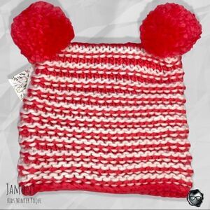 Jamont Knit Double-Pouf Nordic Ski Hat Pom Pom Beanie for Kids in Red-Orange & White