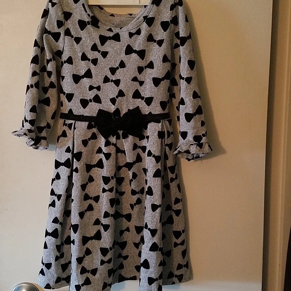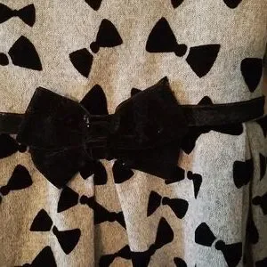 Very cute dress with bows. Label was cut off. In very good condition, worn x2. Grey with Black bows. Velvet belt and bow.