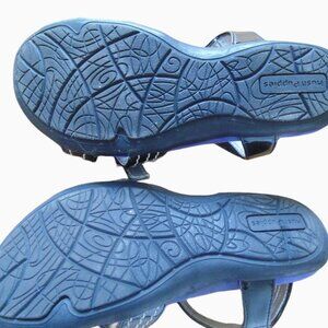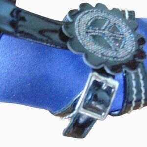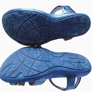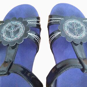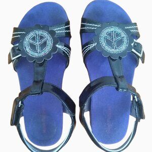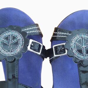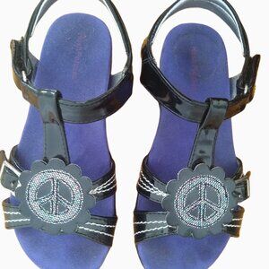 HUSH PUPPIES GIRLS BLACK PATENT LEATHER SANDALS WITH PEACE SYMBOLS IN FRONT AT TOE, VELCRO STRAP AROUND ANKLES, ADJUSTABLE STRAP WITH BUTTON ACROSS TOP TO ADJUST WIDTH, PURPLE INTERIOR, SIZE 1M. PRE-OWNED, GOOD CONDITION, SOLES IN EXCELLENT CONDITION.