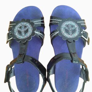 KIDS HUSH PUPPIES BLACK PATENT LEATHER SANDALS W/PEACE SYMBOLS SIZE 1M