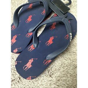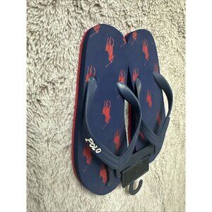 The product is a stylish Ralph Lauren Polo Whitlebury Pony Flip Flop in boys size 1 junior. These sandals feature a solid blue and red color scheme with pony accents, making them perfect for summer and spring activities such as travel and activewear. The elastic slides closure and rubber outsole provide comfort and convenience, while the classic Ralph Lauren design adds a touch of sophistication to any outfit. Perfect for young boys who want to look stylish and sporty while staying comfortable in their footwear.
