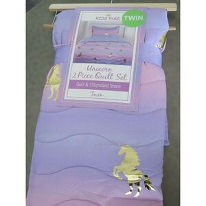 FROM THE Kids Rule COLLECTIONUnicorns Gold Metallic Purple & Pink Ombre Background Reversible to Solid Purple!!!!!!!2 Piece QUILT SET with Sham
