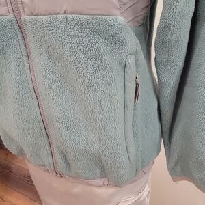 Kisa The North Face Jacket (sz - large). The color of the jacket is light teal and light gray. It is in great condition. Chest measurement from underarm to underarm is 21" Measurement from shoulder to hemline is 23" Sleeve length from underarm to cuff is 17".