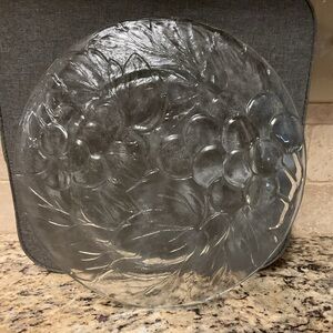 KIG Indonesia Vintage clear glass plate with an embossed grape and leaf design.