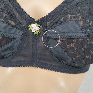 Black lace cups, no wires or padding. Small flaw on front otherwise great.