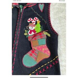 Add a touch of festive cheer to your wardrobe with this KIKIT Embroidered Christmas Sweater Vest. The tight-knit sweater features a collared neckline and full zip front, perfect for both party and casual occasions. This sleeveless sweater comes in women's size L and is embroidered, adding a pop of color to the black solid pattern.
