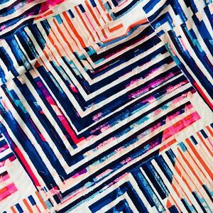 Vibrant skirt featuring a striking geometric pattern in blue, pink, purple, white and orange. Perfect for adding a pop of color to your wardrobe. 2” wide elastic royal blue waistband. Polyester and spandex blend. Great with mostly any color top. Approximate measurements are waist 15”, length from waist 24”.