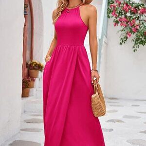 This KILIG rose pink halter maxi dress is lightweight, soft, and comfortable with an adjustable halter neck and side slit. Perfect for summer outings, beach trips, vacations, or weddings. Feminine and elegant for effortless everyday style.