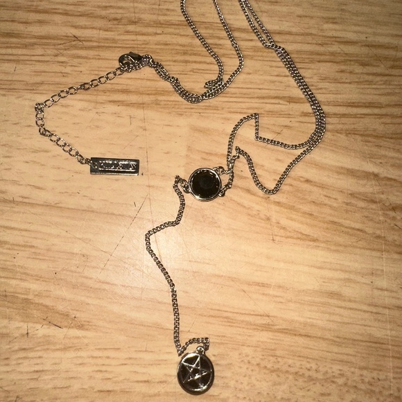 VINTAGE KILLSTAR GOTHIC 2 REVERSIBLE BLACK ONYX STONE ON ONE SIDE AND SILVER PENTAGRAM ON THE OTHER SIDE - ON AN 18" CHAIN SILVER COLOR (NOT MAGNETIC) IT IS NOT STAMPED SO NOT SURE IF ITS SILVER OR STAINLESS STEEL TAG IS LOST.