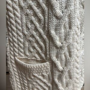 Perfect for layering, this quality made versatile piece adds a touch of elegance to any outfit, cable knit , very soft merino wool, pockets, relaxed fit, made in Ireland and is Brand New! Such a very beautifully made Ireland vest . Could fit S-L because it’s open front and roominess . Brand new without tags !