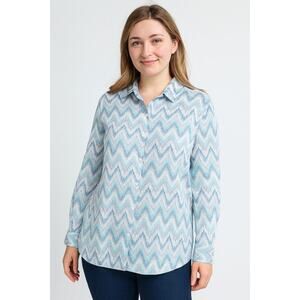 KIM ROGERS 100% Linen Blue Chevron Round Hem Button Down Shirt. Womens Petite Large. Excellent condition.