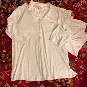 NWOT soft blue polka dot PJ’s w/pocket,7 buttons and trim on 25”top.Elastic and drawstring bottoms 40” long.Sleeve 16”.